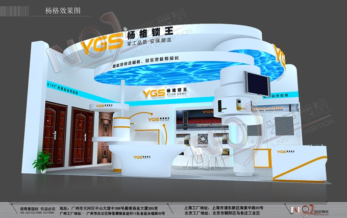 契合楊格鎖業(yè)的品牌形象和產(chǎn)品特性,采用弧形、框架結(jié)構(gòu),再搭配燈具燈光的效果,襯托出展位自由、抽象的氛圍,突出一種簡(jiǎn)約、典雅的時(shí)尚品味。