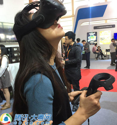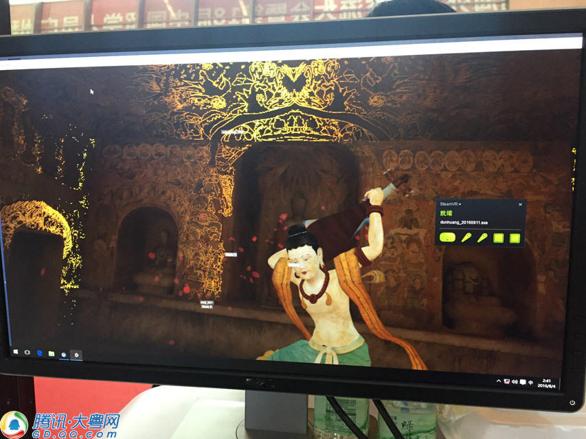 圖中女孩正在用HTC的VR設備,看敦煌莫高窟的360全景圖。該全景圖的設計公司是廣州思創(chuàng)之間,兩個手柄左邊是虛擬空間里的手電筒,右邊是“魔法棒”。