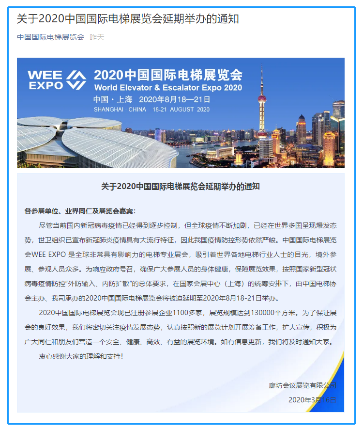 根據(jù)電梯展設(shè)計(jì)搭建公司領(lǐng)藝展覽了解到,為響應(yīng)政府號(hào)召,確保廣大參展人員的身體健康,保障展覽效果,按照國(guó)家新型冠狀病毒疫情防控“外防輸入、內(nèi)防擴(kuò)散”的總體要求。2020中國(guó)國(guó)際電梯展覽會(huì)將延期至2020年8月18-21日舉辦。如需電梯展展會(huì)設(shè)計(jì)請(qǐng)聯(lián)系領(lǐng)藝展覽,希望我們能在電梯展搭建上為您添磚加瓦,祝各位朋友收獲多多,滿載而歸!