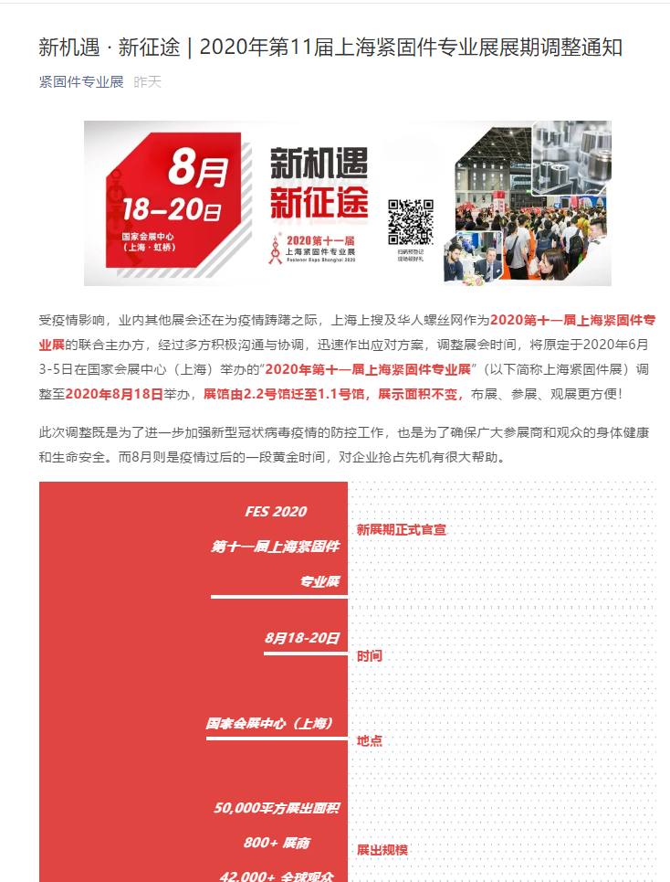 根據(jù)上海展會設(shè)計(jì)搭建公司領(lǐng)藝展覽了解到,將原定于2020年6月3-5日在國家會展中心(上海)舉辦的“2020年第十一屆上海緊固件專業(yè)展”(以下簡稱上海緊固件展)調(diào)整至2020年8月18日舉辦,展館由2.2號館遷至1.1號館,展示面積不變,布展、參展、觀展更方便!如需緊固件展會設(shè)計(jì)請聯(lián)系領(lǐng)藝展覽,希望我們能在上海緊固件展搭建上為您添磚加瓦,祝各位朋友收獲多多,滿載而歸!