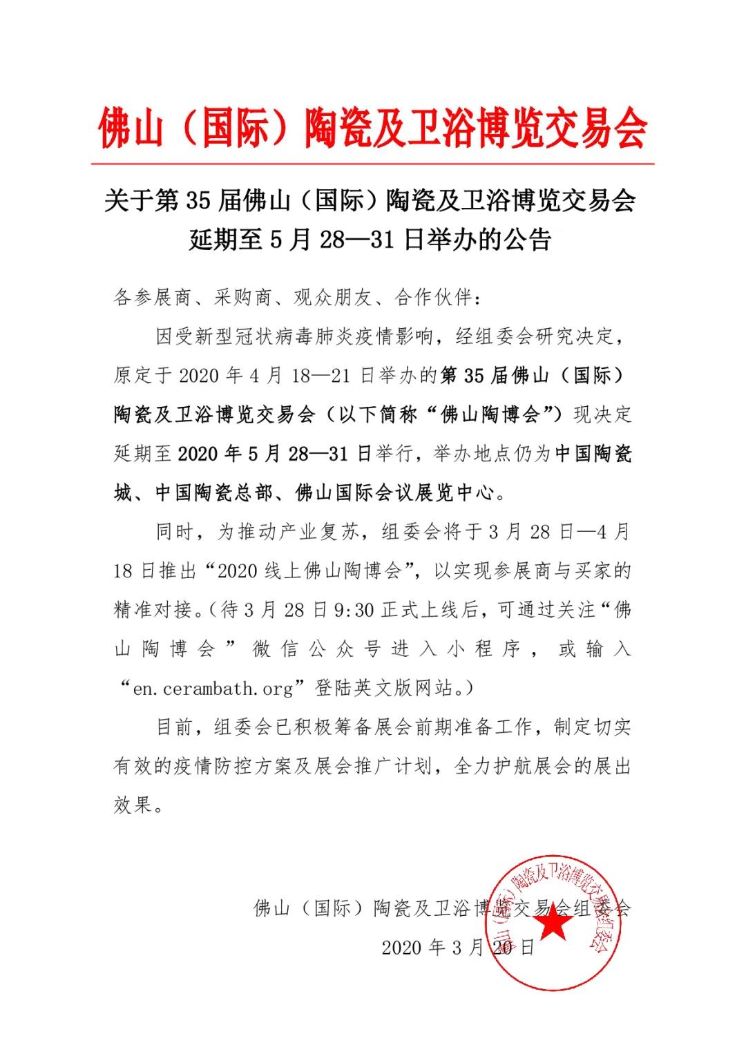 根據(jù)陶博會陶瓷展設(shè)計搭建公司領(lǐng)藝展覽了解到,受新型冠狀病毒疫情防控影響。為全力做好新型冠狀病毒感染肺炎疫情防控工作,為了響應(yīng)及配合疫情防控工作,確保各參展商及觀眾的健康安全,陶博會組委會決定將原定于2020年4月18-21日舉辦的第35屆佛山(國際)陶瓷及衛(wèi)浴博覽交易會將延期至5月28—31日舉辦。如需陶博會設(shè)計請聯(lián)系領(lǐng)藝展覽,希望我們能在陶博會搭建上為您添磚加瓦,祝各位朋友收獲多多,滿載而歸!