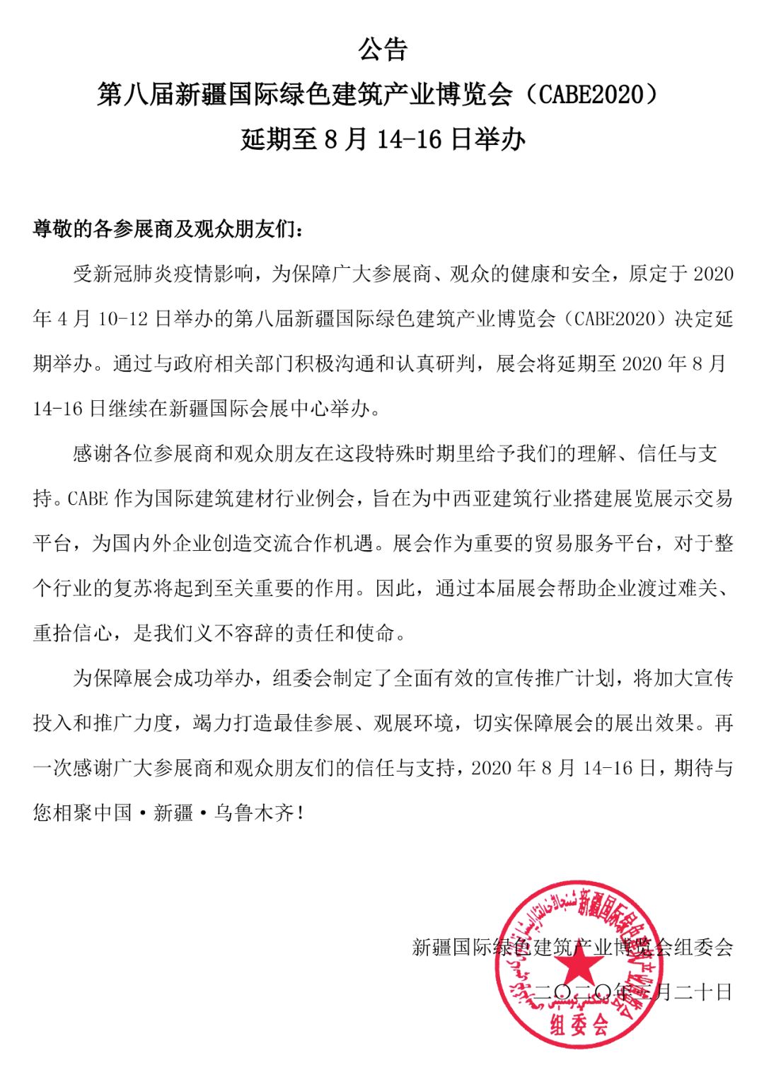 根據(jù)建博會設(shè)計搭建公司領(lǐng)藝展覽了解到,受新冠肺炎疫情影響,原定于2020年4月10-12日舉辦的第八屆新疆國際綠色建筑產(chǎn)業(yè)博覽會(CABE2020),將延期至8月14日至16日在新疆國際會展中心舉行,歡迎您屆時參展參觀。如需建博會設(shè)計請聯(lián)系領(lǐng)藝展覽,希望我們能在建博會搭建上為您添磚加瓦,祝各位朋友收獲多多,滿載而歸!