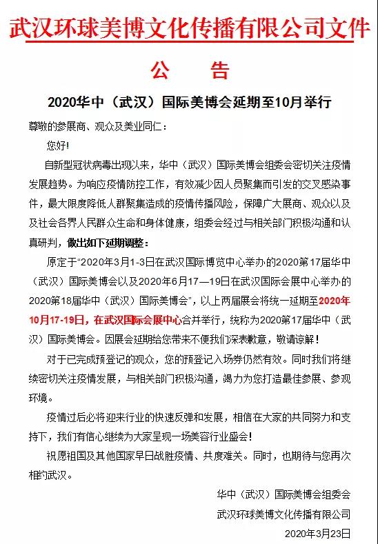 根據(jù)美博會設(shè)計搭建公司領(lǐng)藝展覽了解到,原定于“2020年3月1-3日在武漢國際博覽中心舉辦的2020第17屆華中(武漢)國際美博會”以及“2020年6月17-19日在武漢國際會展中心舉辦的2020第18屆華中(武漢)國際美博會”,以上兩屆展會將統(tǒng)一延期至2020年10月17-19日于武漢國際會展中心合并舉行,統(tǒng)稱為2020第17屆華中(武漢)國際美博會。如需美博會設(shè)計請聯(lián)系領(lǐng)藝展覽,希望我們能在美博會搭建上為您添磚加瓦,祝各位朋友收獲多多,滿載而歸!