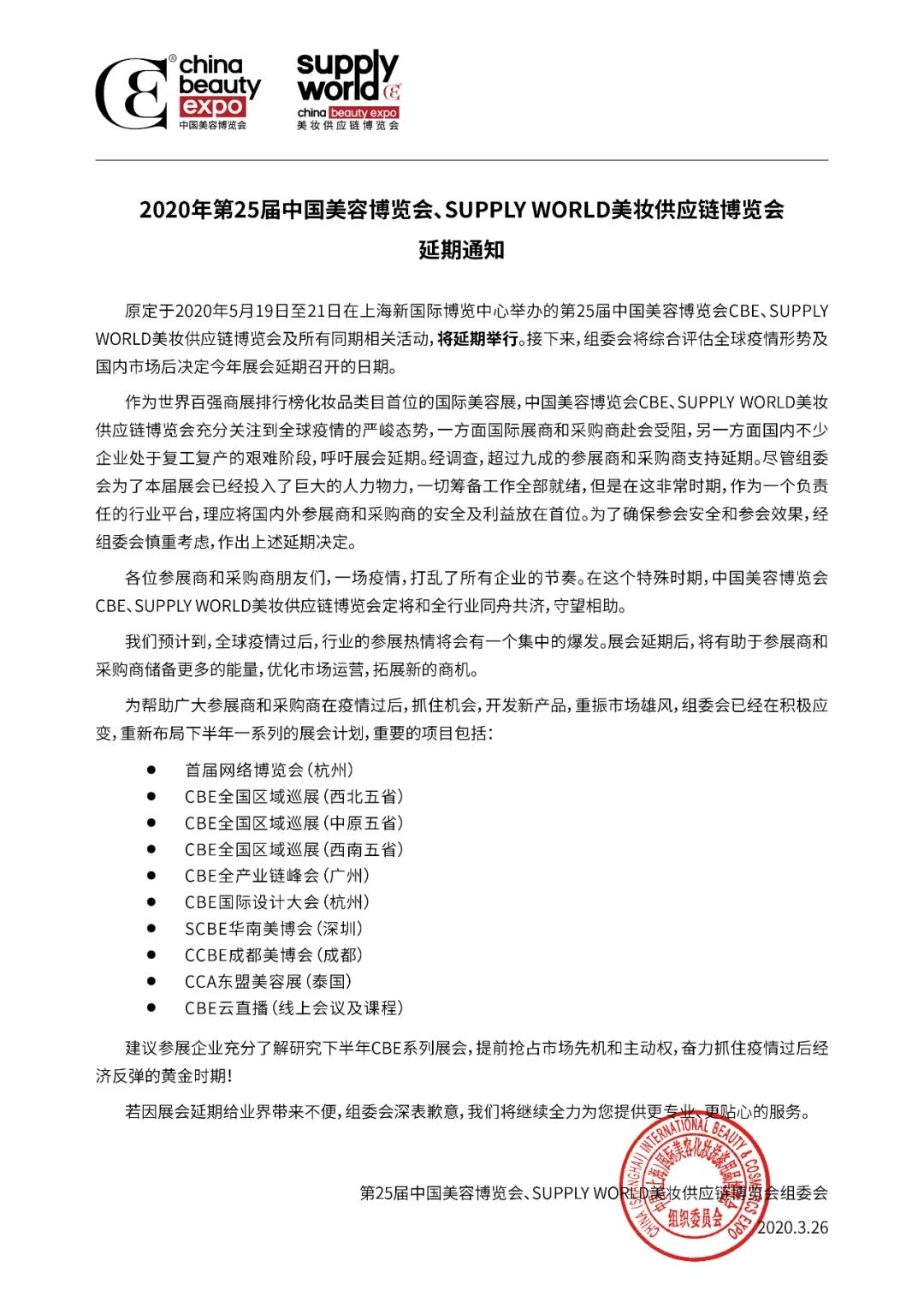 根據(jù)美博會(huì)設(shè)計(jì)搭建公司領(lǐng)藝展覽了解到,原定于2020年5月19日至21日在上海新國(guó)際博覽中心舉辦的第25屆中國(guó)美容博覽會(huì)CBE、SUPPLY WORLD美妝供應(yīng)鏈博覽會(huì)及所有同期相關(guān)活動(dòng),將延期舉行。接下來(lái),組委會(huì)將綜合評(píng)估全球疫情形勢(shì)及國(guó)內(nèi)市場(chǎng)后決定今年展會(huì)延期召開(kāi)的日期。如需美博會(huì)設(shè)計(jì)請(qǐng)聯(lián)系領(lǐng)藝展覽,希望我們能在美博會(huì)搭建上為您添磚加瓦,祝各位朋友收獲多多,滿(mǎn)載而歸!