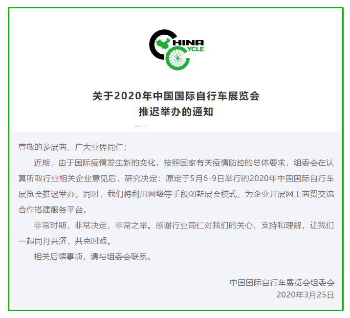 根據(jù)自行車展設(shè)計搭建公司領(lǐng)藝展覽了解到,原定于5月6-9日舉行的2020年中國國際自行車展覽會推遲舉辦。同時,主辦方將利用網(wǎng)絡(luò)等手段創(chuàng)新展會模式,為企業(yè)開展網(wǎng)上商貿(mào)交流合作搭建服務(wù)平臺。如需自行車展設(shè)計請聯(lián)系領(lǐng)藝展覽,希望我們能在自行車展搭建上為您添磚加瓦,祝各位朋友收獲多多,滿載而歸!