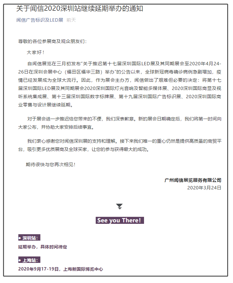 據(jù)LED展設計搭建公司領藝展覽了解到,自聞信展覽在三月初發(fā)布“關于推遲第十七屆深圳國際LED展及其同期展會至2020年4月24-26日在深圳會展中心(福田區(qū)福華三路)舉辦”的公告以來,全球新冠病毒確診病例急劇增加,疫情已經(jīng)發(fā)展成為全球大流行。因此,作為展會主辦方,聞信做出了艱難但必要的決定:將第十七屆深圳國際LED展及其同期展會2020深圳國際燈光音響及智能多媒體展、2020深圳國際商顯及視聽系統(tǒng)集成展、第十三屆深圳國際數(shù)字標牌展、第十九屆深圳國際廣告標識展、2020深圳國際商業(yè)零售與設計展繼續(xù)延期。如需LED展設計請聯(lián)系領藝展覽,希望我們能在LED展搭建上為您添磚加瓦,祝各位朋友收獲多多,滿載而歸!