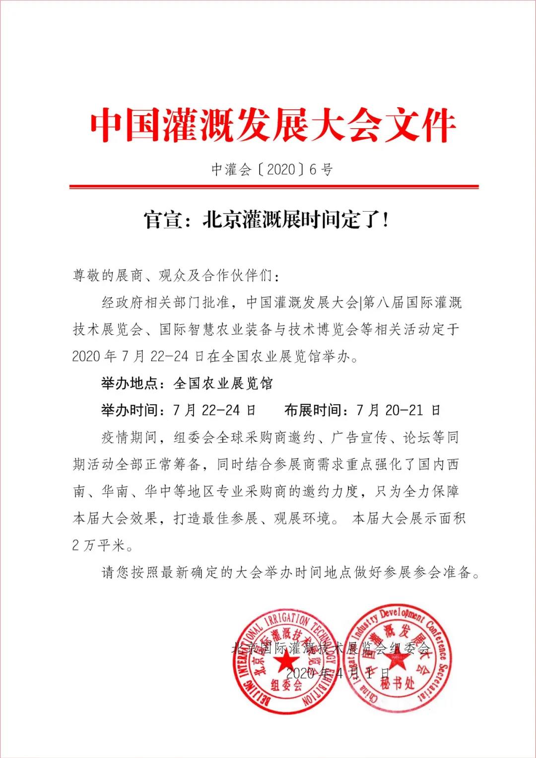 根據(jù)灌溉展設(shè)計(jì)搭建公司領(lǐng)藝展覽了解到,受新冠肺炎疫情影響,原定于2020年4月13-15日舉辦的中國(guó)灌溉發(fā)展大會(huì)|第八屆國(guó)際灌溉技術(shù)展覽會(huì)(ITE2020),將延期至7月22日至24日在北京·全國(guó)農(nóng)業(yè)展覽館(北京市朝陽(yáng)區(qū)東三環(huán)北路16號(hào))舉行。如需灌溉展設(shè)計(jì)請(qǐng)聯(lián)系領(lǐng)藝展覽,希望我們能在灌溉展搭建上為您添磚加瓦,祝各位朋友收獲多多,滿(mǎn)載而歸!