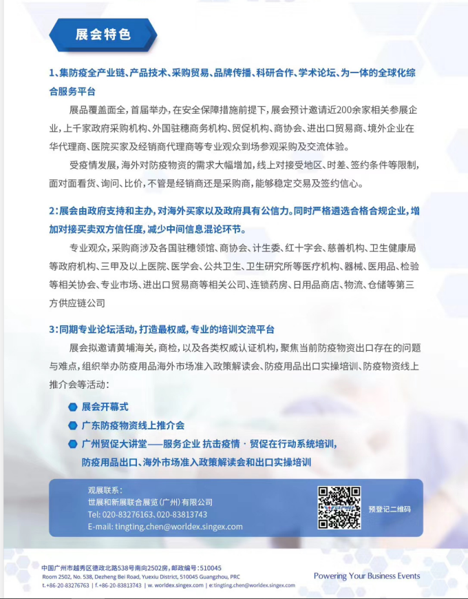 展會(huì)支持單位:中國國際貿(mào)易促進(jìn)委員會(huì)、廣州市委員會(huì)、廣州市商務(wù)局、廣州市工業(yè)和信息化局、廣州市貿(mào)促會(huì)防疫物資出口聯(lián)盟