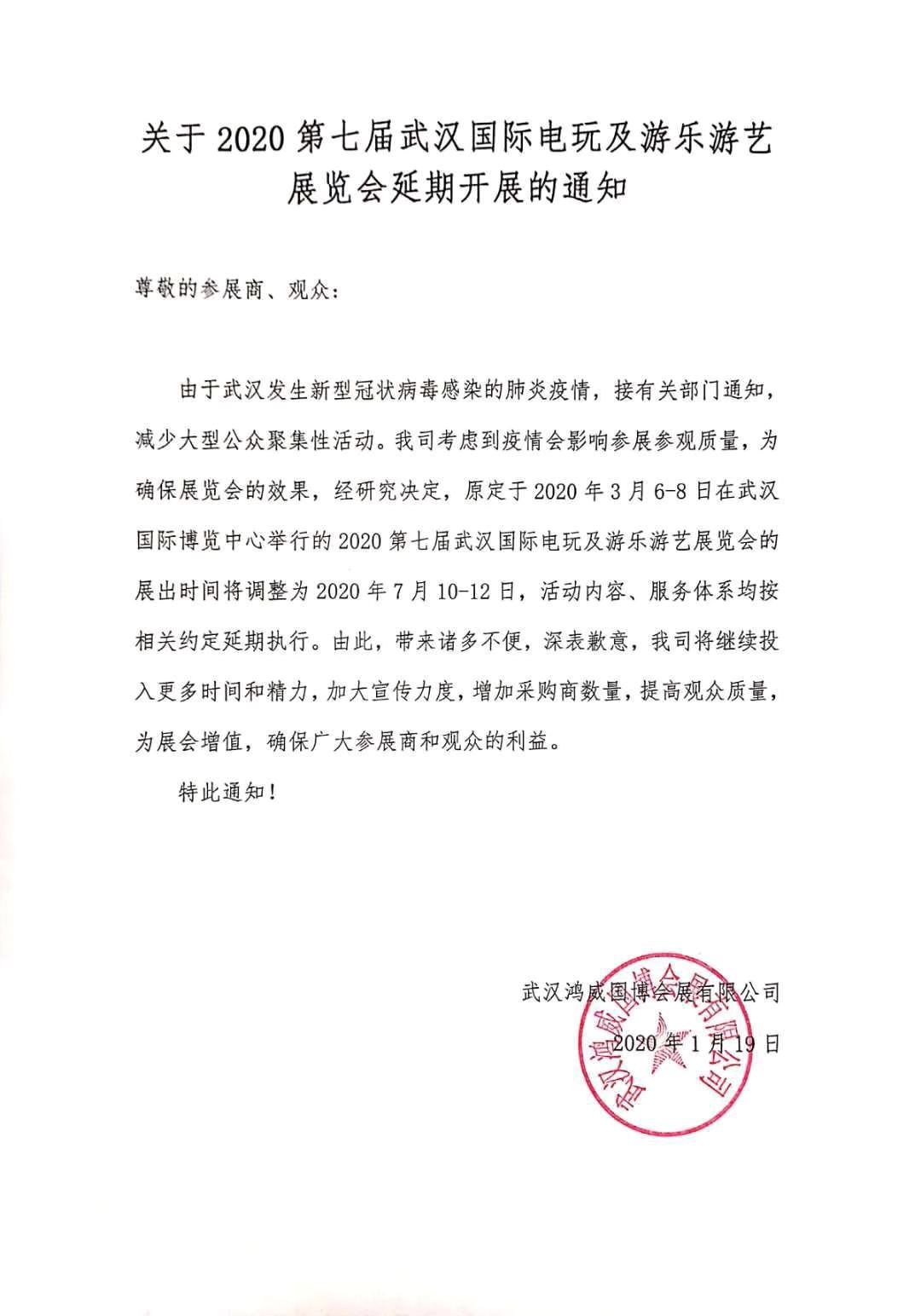 根據(jù)武漢電玩游樂設(shè)備展設(shè)計搭建公司領(lǐng)藝展覽解到,鑒于目前全國發(fā)生“新型冠狀病毒感染肺炎”疫情,為了積極響應(yīng)及配合疫情防控工作,確保各參會人士的安全與健康,并保證參會效果,原定于2020年3月6日-8 日在武漢國際博覽中心舉辦的2020第七屆武漢國際電玩及游樂游藝展覽會將正式延期至2020年7月10日-12日舉辦地點維持不變。如需武漢電玩游樂設(shè)備展設(shè)計請聯(lián)系領(lǐng)藝展覽,希望我們能在武漢電玩游樂設(shè)備展搭建上為您添磚加瓦,祝各位朋友收獲多多,滿載而歸!