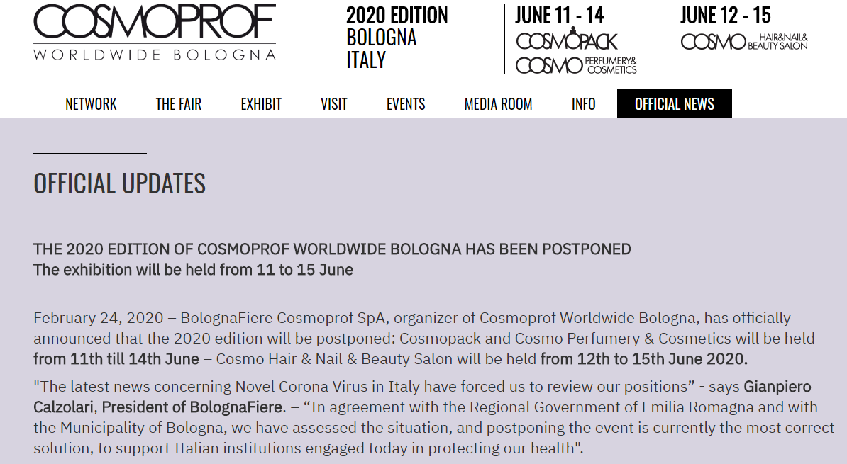 根據(jù)美博會設(shè)計(jì)搭建公司領(lǐng)藝展覽了解到,2020年2月24日 Cosmoprof Worldwide Bologna的組織者BolognaFiere Cosmoprof SpA正式宣布展會將推遲到2020年6月11日至15日舉行。如需美容展設(shè)計(jì)請聯(lián)系領(lǐng)藝展覽,希望我們能在美容展搭建上為您添磚加瓦,祝各位朋友收獲多多,滿載而歸!
