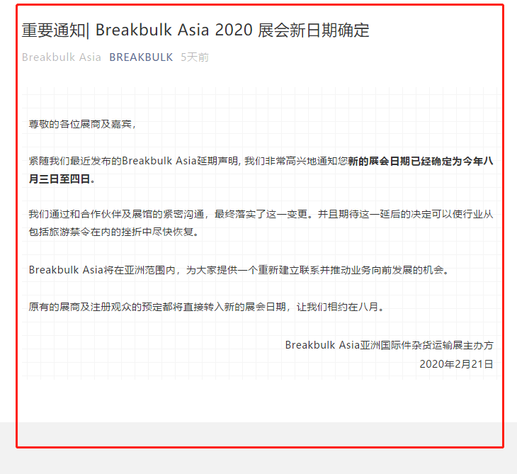 根據(jù)亞洲國際件雜貨運(yùn)輸展設(shè)計搭建公司領(lǐng)藝展覽了解到,緊隨著主辦最近發(fā)布的Breakbulk Asia延期聲明, 我們非常高興地通知原定于2020年3月18日至19日在上海世博展覽館舉辦的Breakbulk Asia亞洲國際件雜貨運(yùn)輸展覽會新的展會日期已經(jīng)確定為今年八月三日至四日。如需物流展設(shè)計請聯(lián)系領(lǐng)藝展覽,希望我們能在物流展搭建上為您添磚加瓦,祝各位朋友收獲多多,滿載而歸!