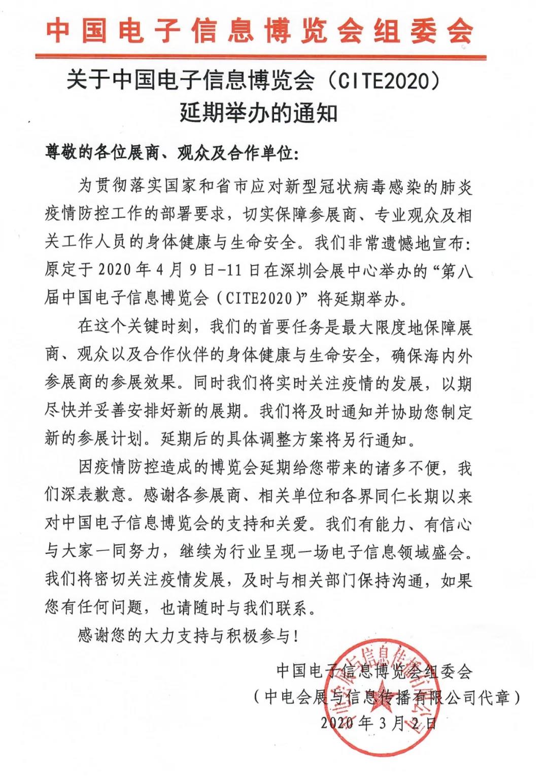 根據(jù)深圳電子展設(shè)計(jì)搭建公司領(lǐng)藝展覽了解到,原定于2020年4月9-11日在深圳會(huì)展中心舉辦的第八屆中國(guó)電子信息博覽會(huì)延期,延期后的具體調(diào)整方案將另行通知。如需深圳電子展設(shè)計(jì)請(qǐng)聯(lián)系領(lǐng)藝展覽,希望我們能在深圳電子展搭建上為您添磚加瓦,祝各位朋友收獲多多,滿(mǎn)載而歸!
