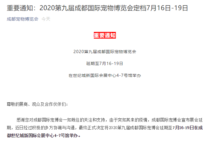 根據(jù)成都寵物展設(shè)計(jì)搭建公司領(lǐng)藝展覽了解到,由于突如其來的疫情,成都國際寵博會(huì)宣布展會(huì)延期,近日經(jīng)過積極的多方協(xié)調(diào)與溝通,最終正式?jīng)Q定將2020第九屆成都國際寵博會(huì)延期至7月16-19日在成都世紀(jì)城新國際會(huì)展中心4-7號(hào)館舉辦。如需成都寵物展設(shè)計(jì)請(qǐng)聯(lián)系領(lǐng)藝展覽,希望我們能在成都寵物展搭建上為您添磚加瓦,祝各位朋友收獲多多,滿載而歸!