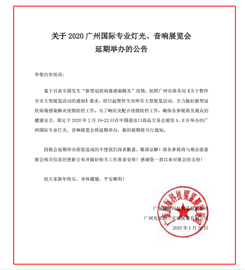 根據(jù)廣州燈光音響展設(shè)計搭建公司領(lǐng)藝展覽了解到,鑒于目前全國發(fā)生“新型冠狀病毒感染肺炎”疫情,按照廣州市商務(wù)局《關(guān)于暫停 全市大型展覽活動的通知》要求,即日起暫停全市所有大型展覽活動,全力做好新型冠 狀病毒感染肺炎疫情防控工作。為了響應(yīng)及配合疫情防控工作,確保各參展商及觀眾的 健康安全,原定于 2020 年 2 月 19-22 日在中國進(jìn)出口商品交易會展館 A、B 區(qū)舉辦的廣 州國際專業(yè)燈光、音響展覽會將延期舉辦,新的展期將另行通知。 如需廣州燈光音響展設(shè)計請聯(lián)系領(lǐng)藝展覽,希望我們能廣州燈光音響展搭建上為您添磚加瓦,祝各位朋友收獲多多,滿載而歸!