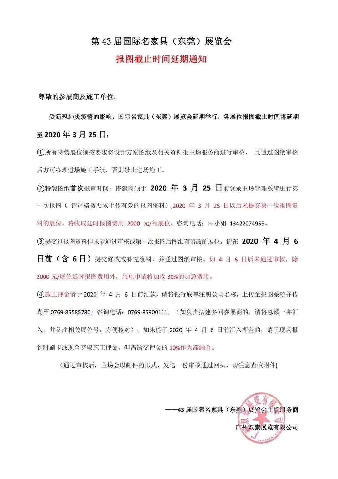 根據(jù)東莞名家具展設(shè)計(jì)搭建公司領(lǐng)藝展覽了解到,受新冠肺炎疫情的影響。國(guó)際名家具展(延期)舉行,各展位截止報(bào)圖時(shí)間將延期至2020年3月25日。如需名家具展設(shè)計(jì)請(qǐng)聯(lián)系領(lǐng)藝展覽,希望我們能在名家具展搭建上為您添磚加瓦,祝各位朋友收獲多多,滿載而歸!
