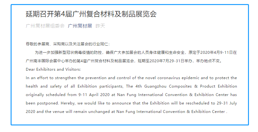 延期召開第4屆廣州復(fù)合材料及制品展覽會