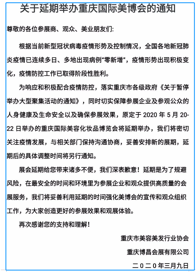 根據(jù)美博會指定展臺設(shè)計(jì)搭建公司領(lǐng)藝展覽了解到,因我國新型冠狀病毒的影響,各省市均已啟動一級響應(yīng),并全面取消或延期各類大型活動。為積極配合疫情防治工作的開展,原定于2020年5月20-22日在重慶舉辦的重慶國際美博會將延期舉行,如需美博會展臺設(shè)計(jì)請聯(lián)系領(lǐng)藝展覽,希望我們能在美博會展臺搭建上為您添磚加瓦,祝各位朋友收獲多多,滿載而歸!