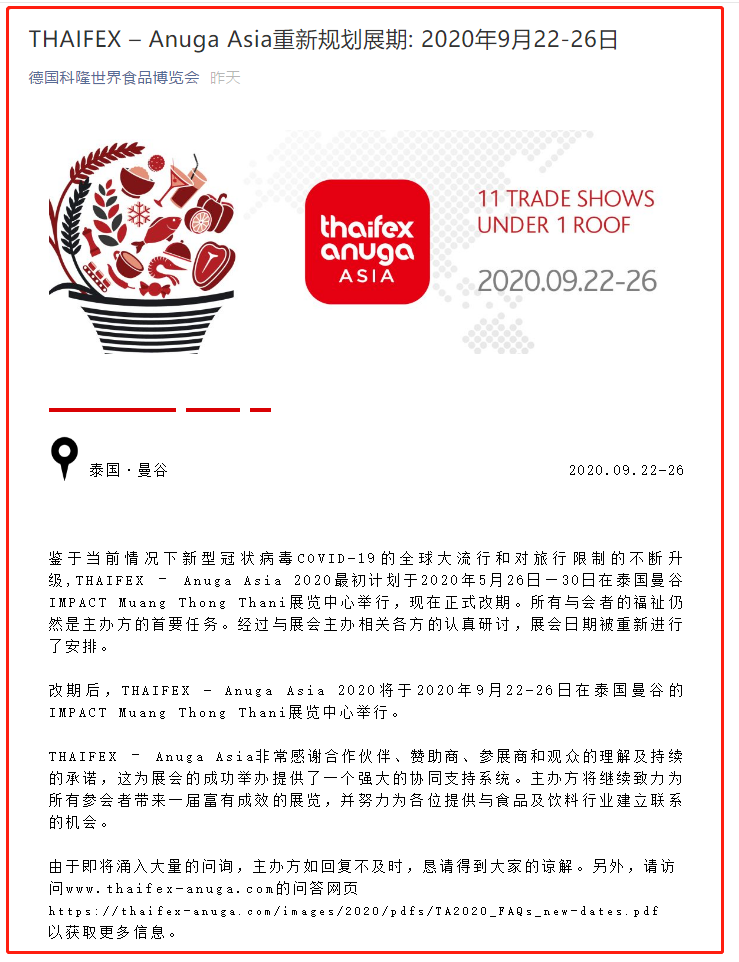 根據(jù)食品展設(shè)計(jì)搭建公司領(lǐng)藝展覽了解到,鑒于當(dāng)前情況下新型冠狀病毒COVID-19的全球大流行和對(duì)旅行限制的不斷升級(jí),THAIFEX – Anuga Asia 2020最初計(jì)劃于2020年5月26日—30日在泰國(guó)曼谷IMPACT Muang Thong Thani展覽中心舉行,現(xiàn)在正式改期。所有與會(huì)者的福祉仍然是主辦方的首要任務(wù)。經(jīng)過(guò)與展會(huì)主辦相關(guān)各方的認(rèn)真研討,展會(huì)日期被重新進(jìn)行了安排。改期后,THAIFEX - Anuga Asia 2020將于2020年9月22-26日在泰國(guó)曼谷的IMPACT Muang Thong Thani展覽中心舉行。如需食品展設(shè)計(jì)請(qǐng)聯(lián)系領(lǐng)藝展覽,希望我們能在食品展搭建上為您添磚加瓦,祝各位朋友收獲多多,滿(mǎn)載而歸!