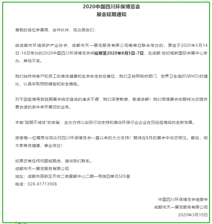 根據(jù)環(huán)保展設計搭建公司領藝展覽了解到,原定于2020年5月14日-16日舉辦的2020中國四川環(huán)保博覽會將延期至2020年8月5日-7日,在成都·世紀城新國際會展中心舉辦,其他不變。 如需環(huán)保展設計請聯(lián)系領藝展覽,希望我們能在環(huán)保展搭建上為您添磚加瓦,祝各位朋友收獲多多,滿載而歸!