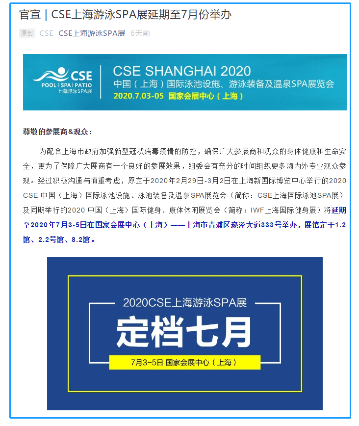 根據(jù)上海展會設計搭建公司領藝展覽了解到,原定于2020年2月29日-3月2日在上海新國際博覽中心舉行的2020 CSE 中國(上海)國際泳池設施、泳池裝備及溫泉SPA展覽會(簡稱:CSE上海國際泳池SPA展)及同期舉行的2020 中國(上海)國際健身、康體休閑展覽會(簡稱:IWF上海國際健身展)將延期至2020年7月3-5日在國家會展中心(上海)——上海市青浦區(qū)崧澤大道333號舉辦,展館定于1.2館、2.2號館、8.2館。如需上海展會設計請聯(lián)系領藝展覽,希望我們能在上海展會搭建上為您添磚加瓦,祝各位朋友收獲多多,滿載而歸!